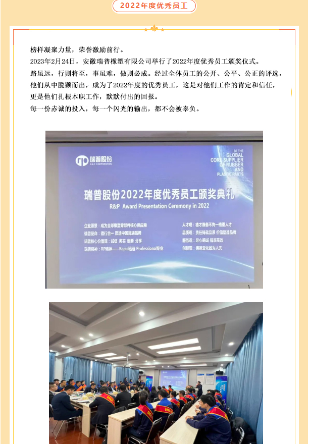 董事長對各部門、子公司負責人的2022年度總結及2023年度工作規(guī)劃進行分析,對大家疫情期間的工作予以肯定,并對其薄弱與不足之處提出改進意見。2023年公司將圍繞開拓新市場、項目管理制度、事業(yè)部智能化制造、員工工作能力、公司管理制度等方面進行提升。努力為員工提供更好的福利待遇,為客戶提供更優(yōu)質的服務,為實現(xiàn)瑞普成為全球橡塑零部件核心供應商的企業(yè)愿景而不懈努力!